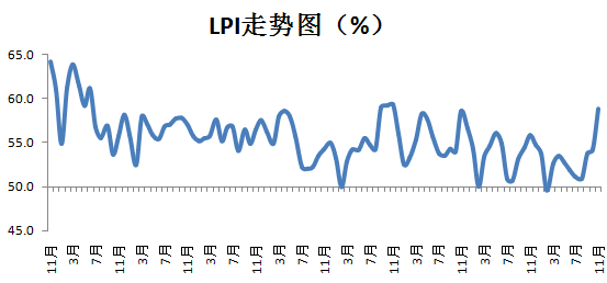 11月份中国物流业景气指数为58.9%,较上月回升4.7个百分点;中国仓储指数为54.4%,较上月回升3.5个百分点。