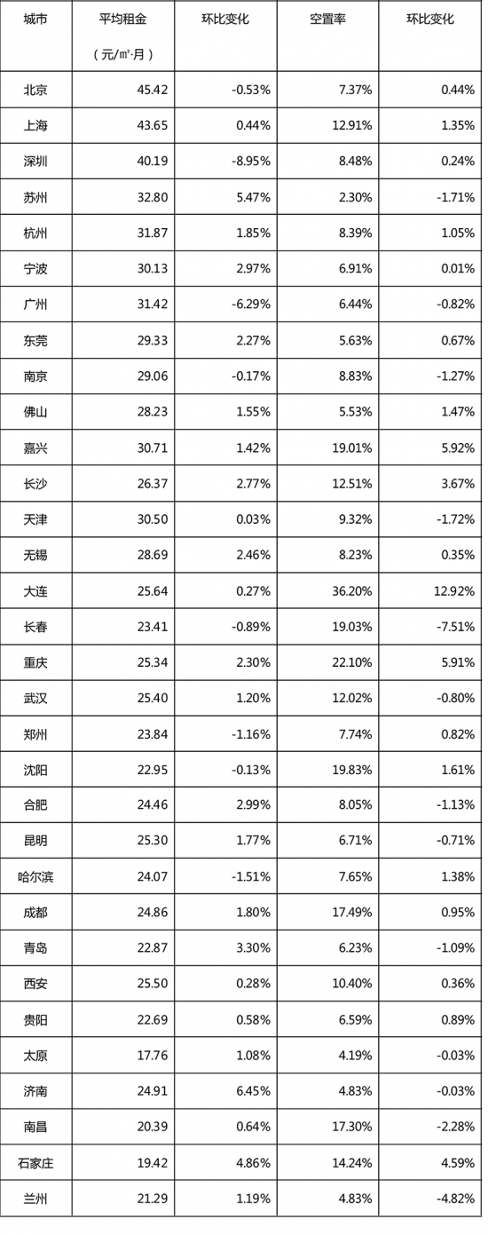仓库空置率最低的城市为济南、兰州、太原、苏州,均低于5%。相较10月,济南、太原、苏州仓库空置率波动不大,市场稳定;兰州因仓库租户以日用百货企业为主,随着圣诞、元旦、春节等节日临近,部分企业开始扩仓备货,导致当地租仓需求增加,仓库空置率有所下降,降幅为4.82%。