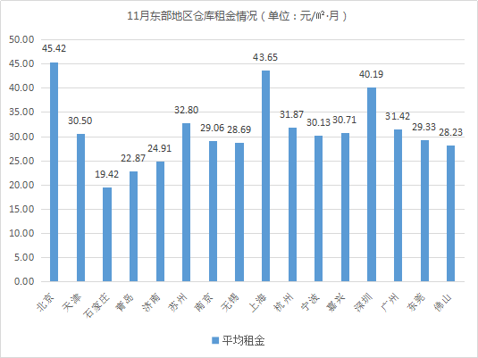 全国32个城市仓库平均租金为27.48元/㎡·月,环比上涨0.73%。其中,东部地区仓库平均租金(31.20元/㎡·月)高于西部(24.16元/㎡·月)、东北(24.02 元/㎡·月)、中部(23.04元/㎡·月)地区。相较10月,西部地区仓库平均租金有所上涨,涨幅为1.30%(西部地区);东部、东北、中部地区仓库平均租金保持平稳,增(降)幅在±1%以内。